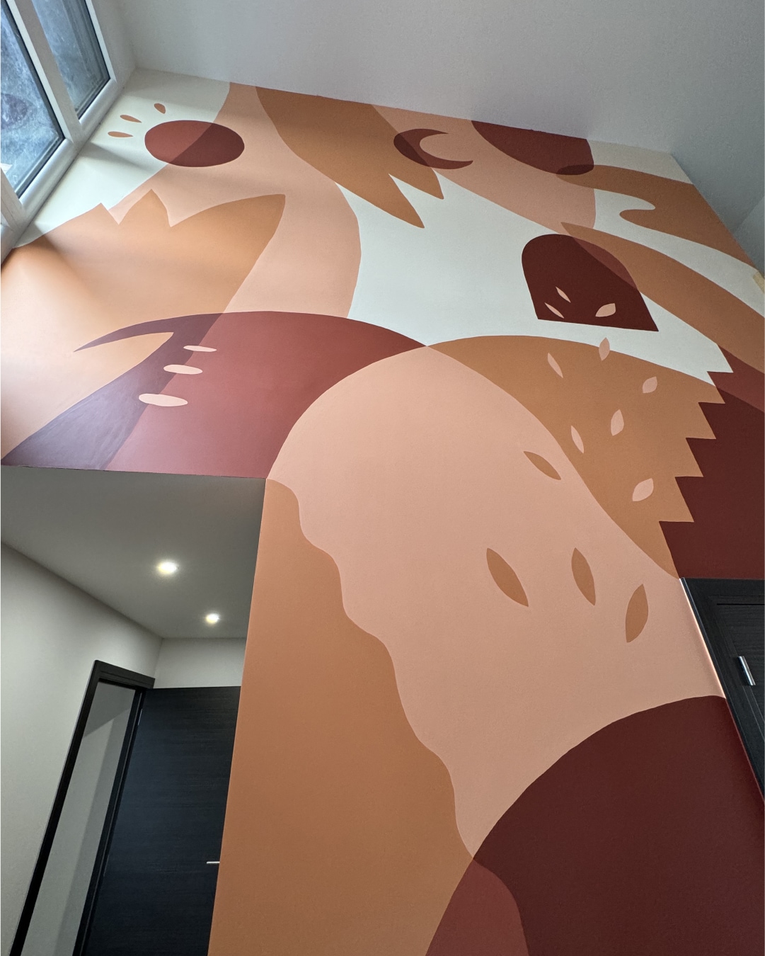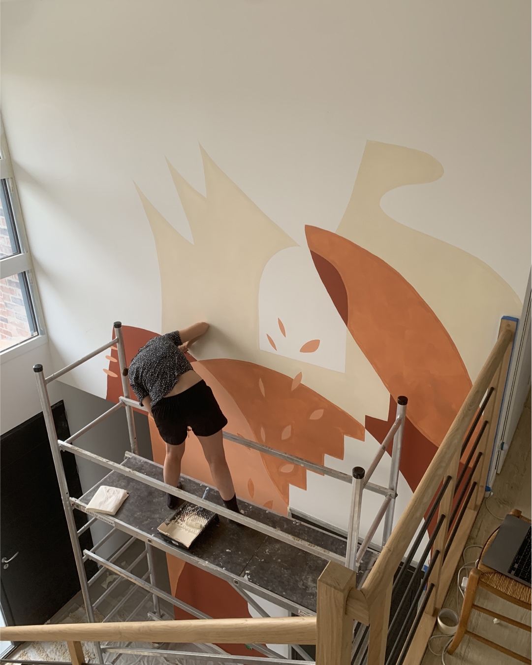Entre échafaudages et quelques vertiges, nous avons créé cette œuvre géante lors de 3 jours intenses de peinture sous le soleil d’août, dans une maison encore en travaux.